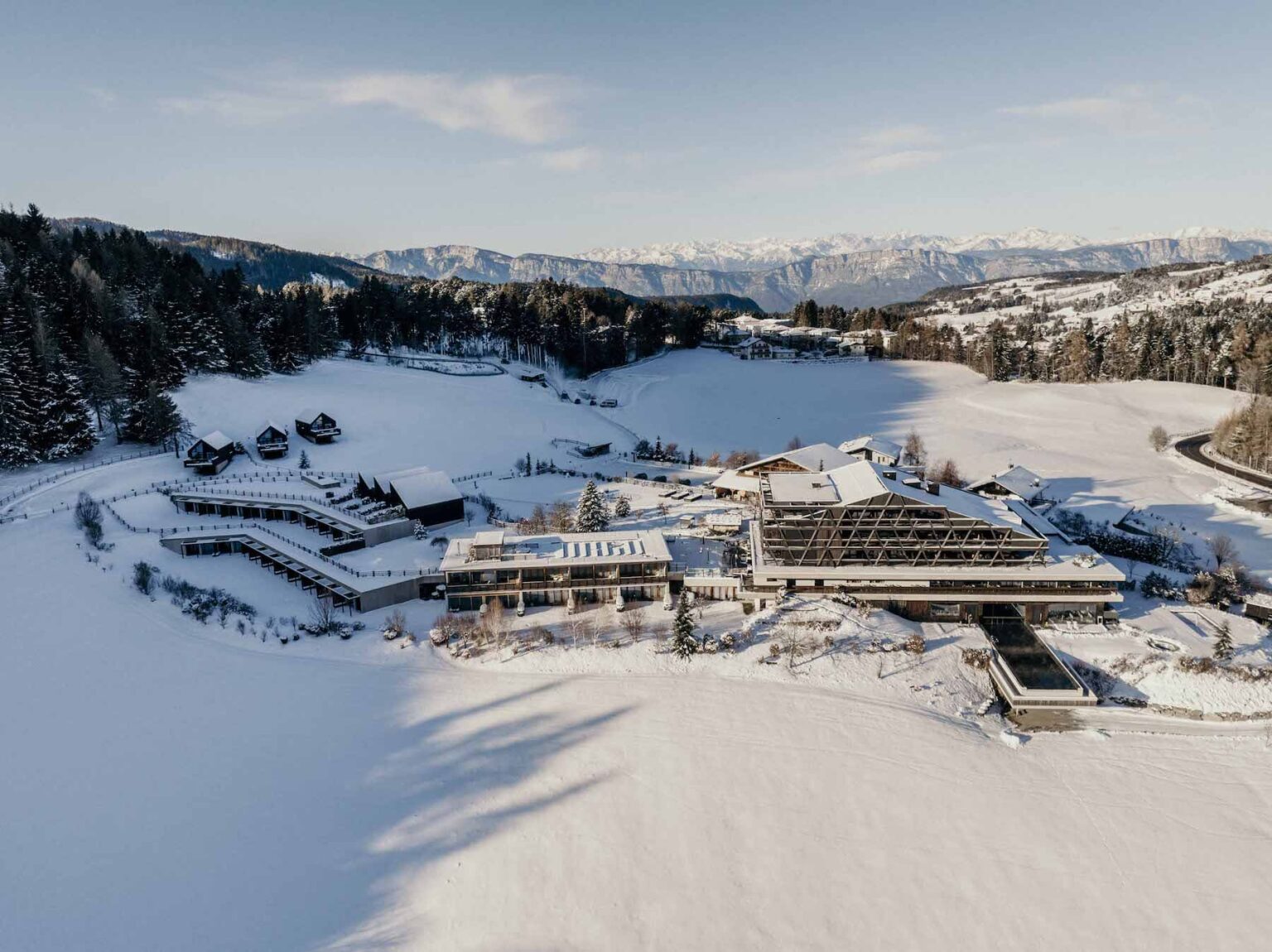 Im Winter verwandelt sich das Pfösl in ein stilles Naturparadies aus Schnee und Licht. Umgeben von 35 Hektar verschneiten Wiesen und Wäldern genießen Gäste hier den Winter auf sanfte, ursprüngliche Weise – beim Rodeln, auf der hauseigenen Kinderpiste oder im Schnee direkt vor dem Hotel. Wer höher hinaus möchte, erreicht mit dem privaten Shuttle in wenigen Minuten das Skigebiet Latemar Dolomites mit 50 Kilometern perfekt präparierten Pisten, dem Kinder-Snowpark „Brunoland“ und der Skischule Obereggen. Auch das Skigebiet Carezza, nur 12 Kilometer entfernt, lockt mit 40 Kilometern Panoramapisten und Blick auf Rosengarten und Latemar. Langläufer und Schneeschuhwanderer starten direkt am Hotel in ein weit verzweigtes Netz aus Höhenloipen und Winterwegen – für ruhiges Eintauchen in die winterliche Bergwelt Südtirols.