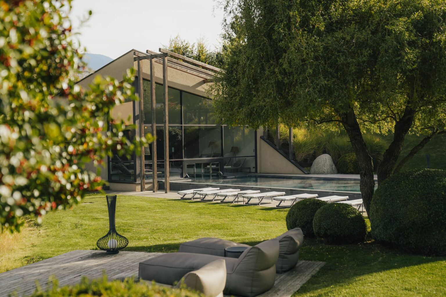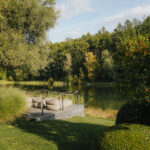 Das Herzstück des Retreats ist der See – ein Spiegelbild der Stille. Um ihn herum erstrecken sich weitläufige Gärten, umgeben von Kiefern und Apfelplantagen. Hier beginnt der Tag mit Vogelgezwitscher und dem sanften Glitzern des Wassers.