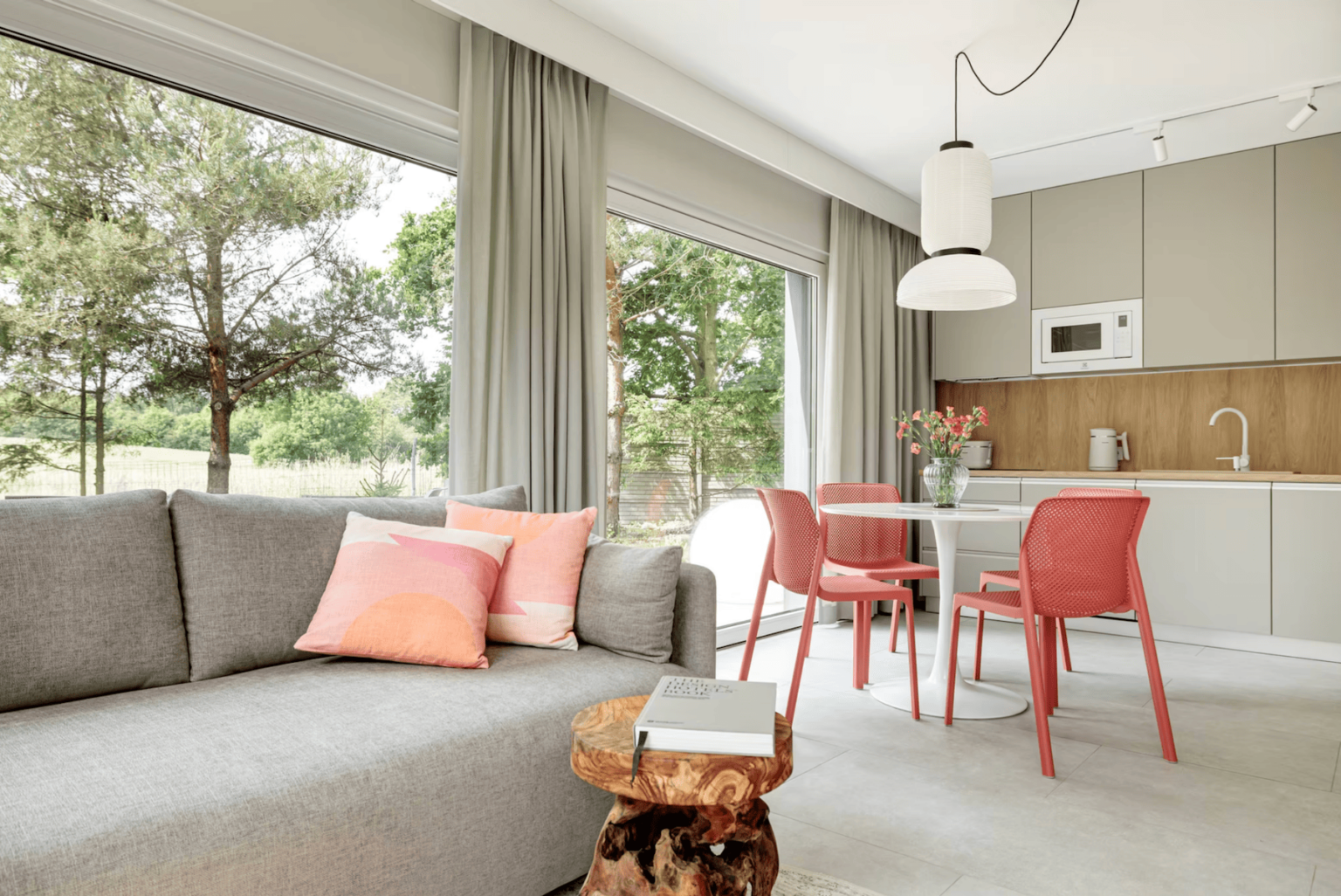Jedes der acht freistehenden Häuser bietet zwei Schlafzimmer, ein Bad mit Dusche, eine voll ausgestattete Küchenzeile und einen offen gestalteten Wohn- und Essbereich mit bodentiefen Fenstern. Einige Cottages verfügen über ein zusätzliches Dachgeschoss mit Schlafsofa für bis zu zwei weitere Gäste. Alle Einheiten haben eine eigene Terrasse mit Gartenblick und sind klimatisier- und beheizbar. Haus 08B bietet zudem eine private Sauna. Ergänzt wird das Angebot durch eine gemeinschaftlich nutzbare finnische Sauna, einen beheizten Außenpool sowie einen Whirlpool im Garten.