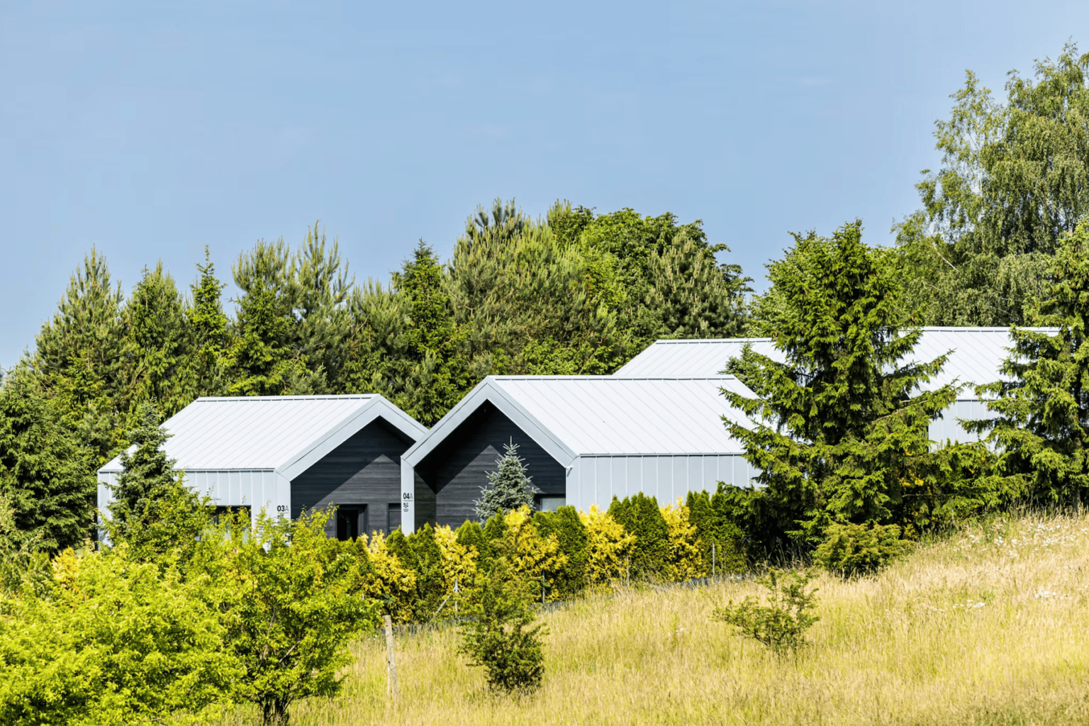 Am Rand des Badeorts Ustronie Morskie, rund zehn Gehminuten vom breiten, feinsandigen Ostseestrand entfernt, liegt das SKARPA Resort: eine kleine, architektonisch durchdachte Anlage mit acht modernen Cottages inmitten üppiger Gräser und umgeben von Kiefern. Die dunklen Fassaden aus Holz und Metall mit schwarzen Fensterrahmen bilden einen markanten Kontrast zur natürlichen Umgebung – innen hingegen dominieren helle Räume, natürliche Materialien und maßgefertigte Einbauten, ergänzt durch lebendige Farbakzente. Große Fensterfronten eröffnen den Blick ins Grüne und holen das Tageslicht in jeden Winkel.